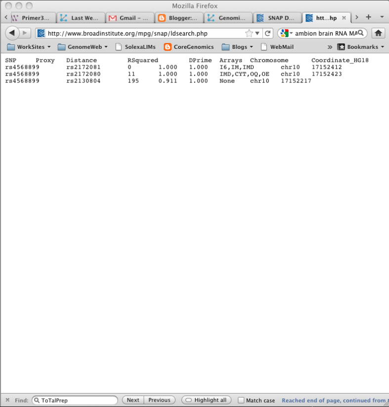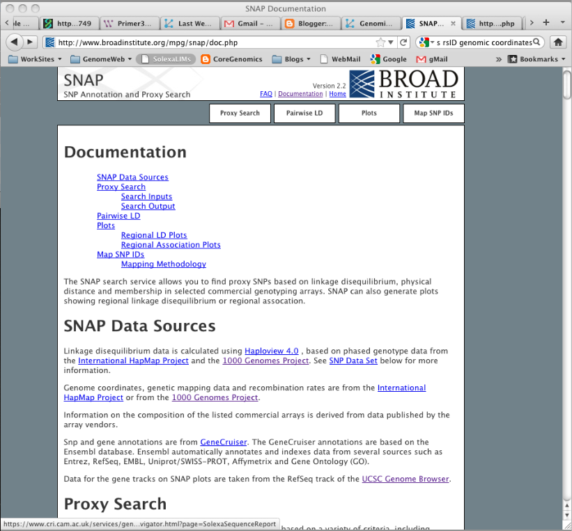Getting SNP locations: I was already sent the locations along with rsID’s but I wanted to see if I could find them myself. I like UCSC and it is usually my first port of call when looking for sequence information. In this case I simply entered an rsID into the UCSC position/search box (Image:UCSC RsID search) and then clicked through the link (Image: UCSC rsID results). This gives me the all important location information, chr1:4181020-4181020 in the case of rs10799216.