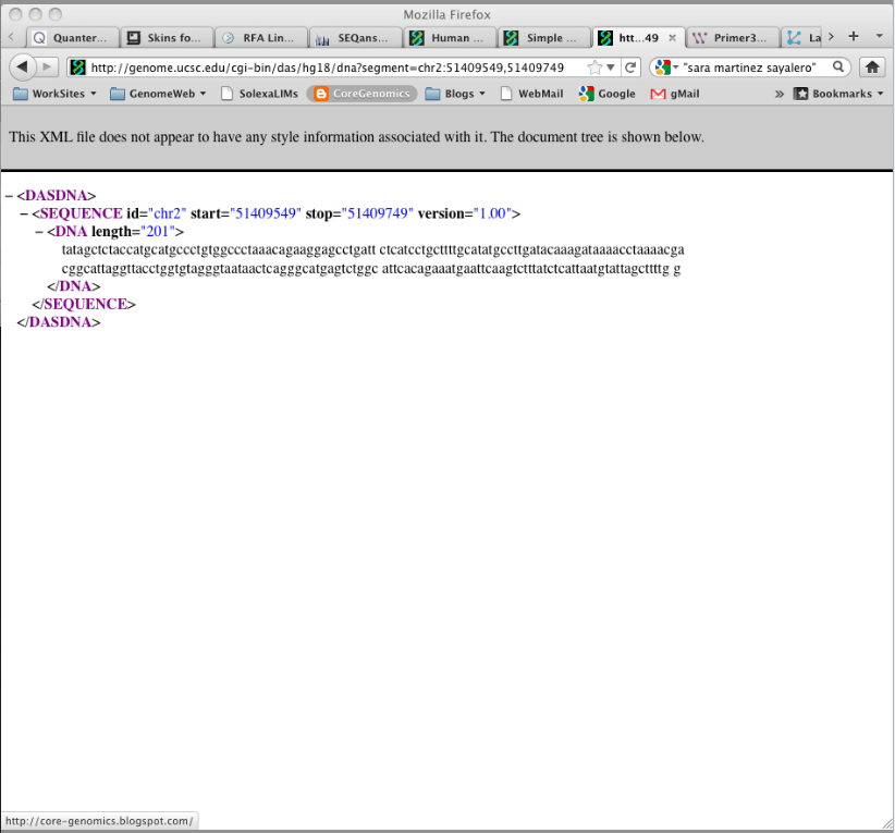 Getting flanking sequence: I used Excel (not a bioinformaticians favourite tool) to create a UCSC DAS address (Image: Excel to create DAS address) to pull out the flanking regions 100bp either side of the SNP (Image: UCSC DAS results).