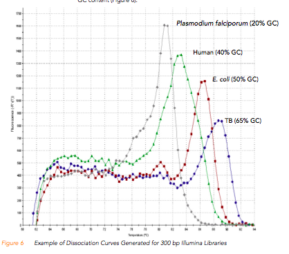 Digital PCR (LOQ 0.03fg): Fluidigm’s digital PCR platform has been released for library quanitifaction as the SlingShot kit, available for both Illumina and 454. This kit does not require a calibrator samples and uses positive well counts to determine a quantitative estimate of the samples actual concentration. A sinlge qPCR reaction is setup and loaded onto the Fluidigm chip. This reaction gets partitioned into 765 9nl chambers for PCR. The DNA is loaded at a concentration that results in many wells having no template present. The count of positive wells after PCR is directly related to starting input and quantitation s very sensitive.