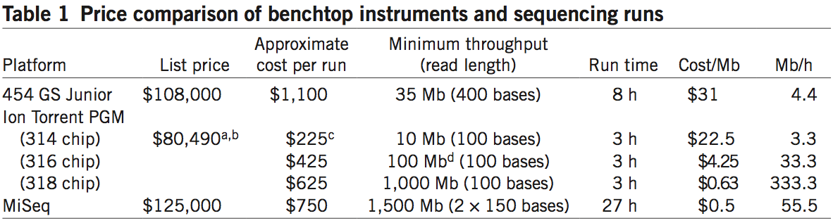 7. Which one should people buy if they want to do bacterial genome sequencing? Ha, the $1000 question – I’d point people at the paper and get them to figure out what was appropriate for their needs and budget.