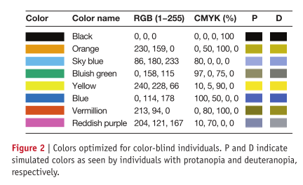 Colour: Spiralling through the colour wheel when choosing colours to use in figures can allow the same visual impact in both colour and black-and-white print. Adobe Illustrator and Photoshop allow you to simulate what Red:Green colour-blindness will do to your figures, and replacing red with magenta makes images accessible for all. Colour can be misleading and sometimes a simple black line will do.