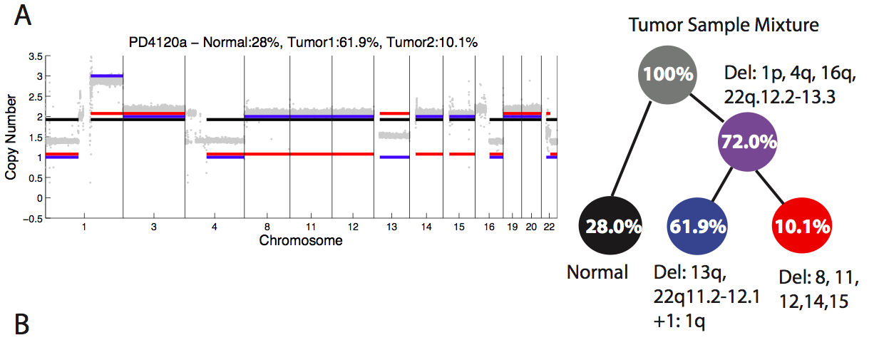 THetA determines distinct cell-populations based on copy-number differences between those populations and requires only 40x genome coverage to do so. Figure 3A from the paper shows the copy number of the sample as determined by read depth in gray, and that for the normal cells (black), dominant clone (blue) or sub-clone (red), and the software builds a family tree of the different cell populations.