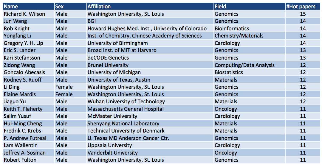 A “driver” paper was A map of human genome variation from population-scale sequencing (1000 Genomes Project, Nature, 467(7319): 1061-73, 2010), which also appeared in the 2011 rankings and is still one of the most highly-cited papers. Several of the hot-list researchers were authors on this highly cited paper. It did not feature in the list of papers in the ScienceWatch report though.