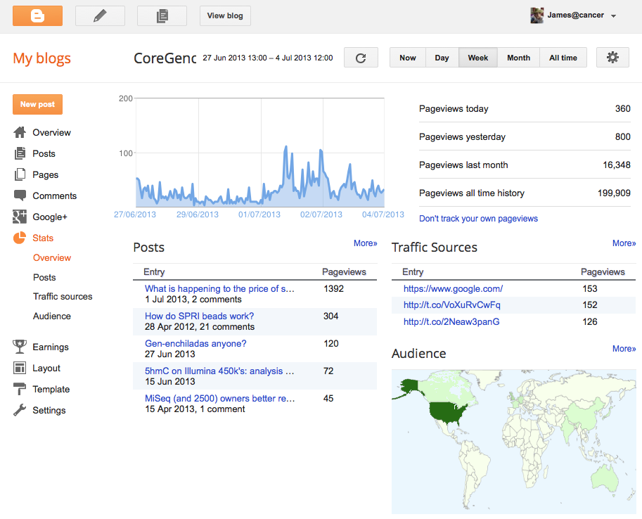 The traffic I get to my blog is a real inspiration to keep writing. I regularly meet people who read my blog at conferences and other meetings, although no-one’s bought me a beer because they liked it so much! I do keep an eye on my stats and occasionally get a massive spike in readers. Usually this is because GenomeWeb has covered one of my blog posts and the numbers of readers can reach over 1000 a day. I’m sure other bloggers see the same effect on their sites too.