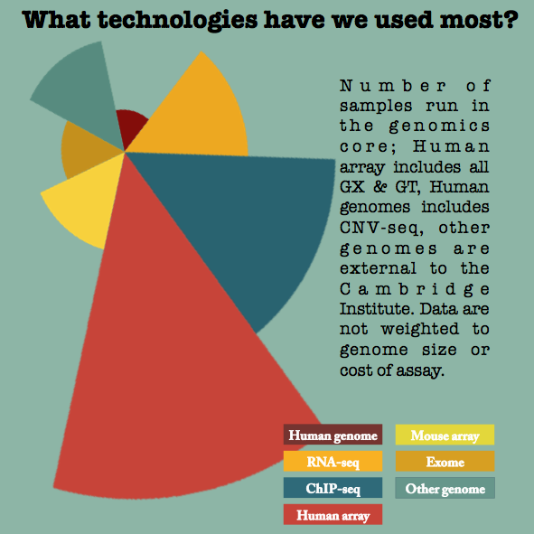 Which technologies do we use in my lab: This chart shows the different technologies we’ve run and the size of the block indicates usage, e.g. we ran over 6000 arrays and about 3000 ChIP-seq samples. I like the expanded view this chart uses to highlight things slightly differently to a normal pie chart.
