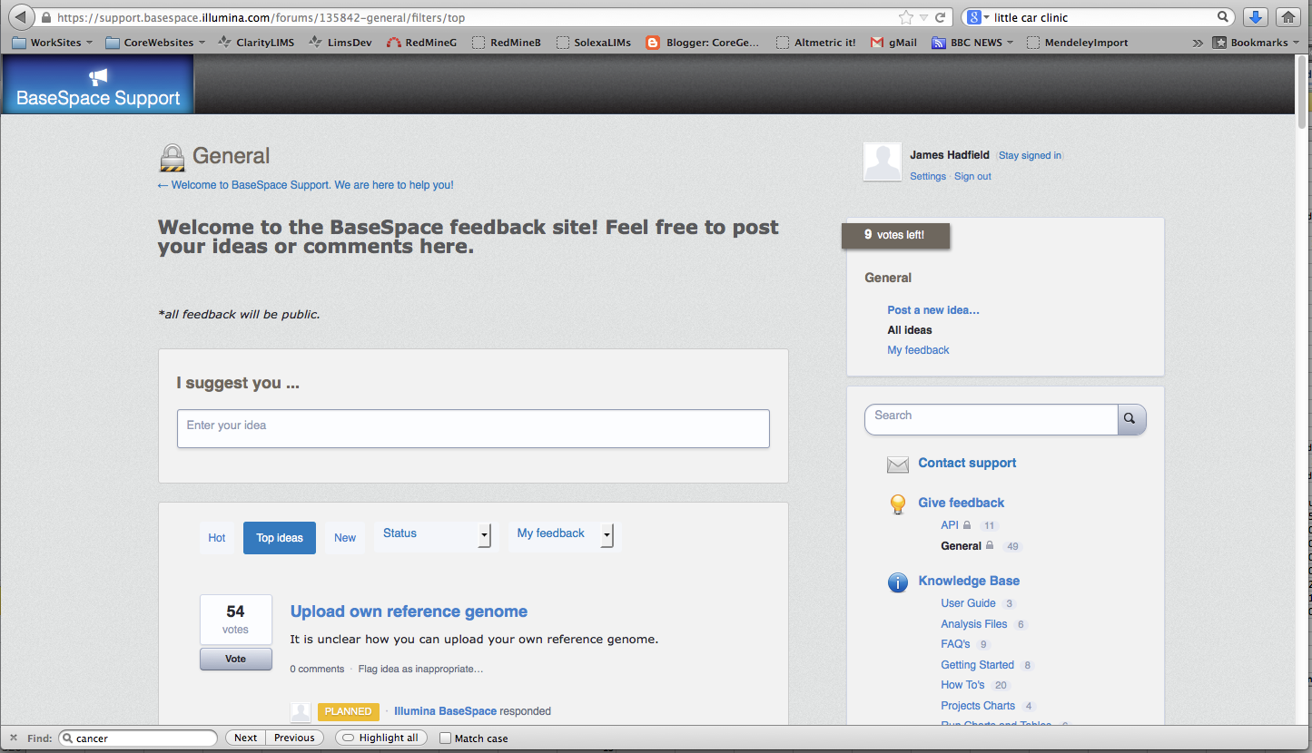 If you are using Illumina’s BaseSpace then you probably run into some of the same frustrations as myself and other users, however Illumina do provide a feedback mechanism and a forum to suggest ideas for development. Finding this can be a bit difficult so in order to remind myself next time I want to find it, and to help others who may be looking, I wrote this post.