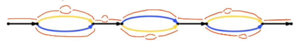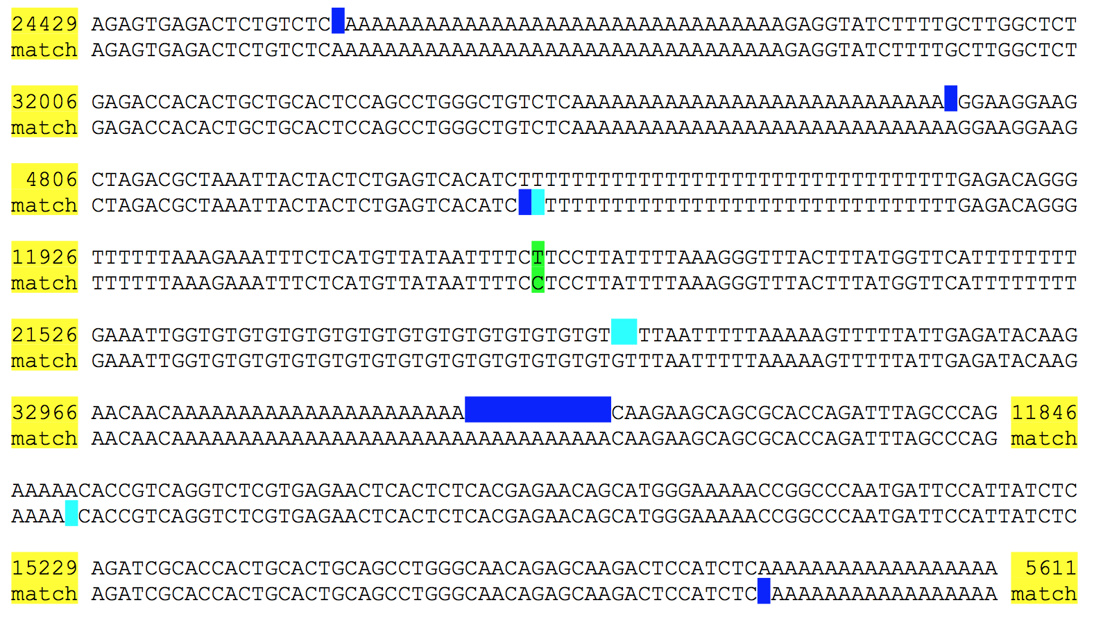 The data: In the paper they present data from seven Human genomes, sequenced on HiSeq X Ten, and assembled using the “pushbutton” Supernova algorithm (it won’t run on your Mac Book Pro as you’ll need >384Gb of RAM). In just two days per genome they generated 100kb+ contigs with 2.5Mb phase blocks. The 7 genomes include 4 with parental data to verify phasing results, as well as one sample used in the HGP. They include a figure (see below) showing the Supernova assembly of the HGP sample aligned to a 162kb clone which is part of the GRCh37 reference. It almost completely matches the reference sequence with the 8 variants including just 1 SNV (green), but 6 homopolymer and 1 di-nucleotide repeat length variants (blue/cyan). The sceond figure shows the representation of the path a FASTA sequence takes through the “megabubbles” separating parental alleles, and “microbubbles” caused by longer repeats and homopolymers.