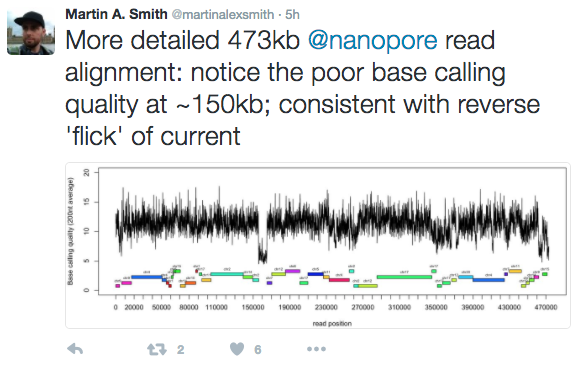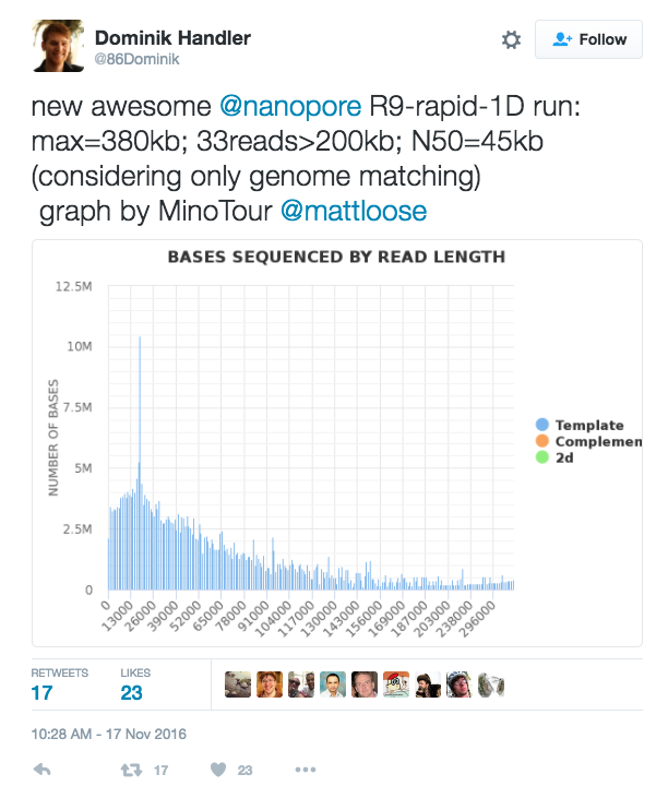 A couple of Tweets today point to the amazing lengths Oxford Nanopores MinION sequencer is capable of generating – over 400kb!