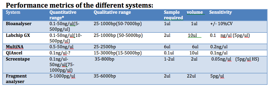 In my lab we are now preparing 24, 48 and 96 libraries in each batch. QC of these has become too much work using current methods so we looked at alternatives. This included the Caliper LabChip GX, Shimazdu MultiNA, Agilent ScreenTape, Qiagen QIAxcel and Advanced Analytical’s Fragment Analyser (see the bottom of this post for a full list of features).