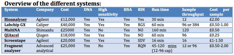 From our analysis of the system features we asked for demonstrations of the Caliper and Advanced Analytical instruments. These two both appeared to give us the throughput and sensitivity we need, both systems worked well and I know of several labs using these instruments very successfully. However we decided not to invest in a high-throughput Bioanalyser.